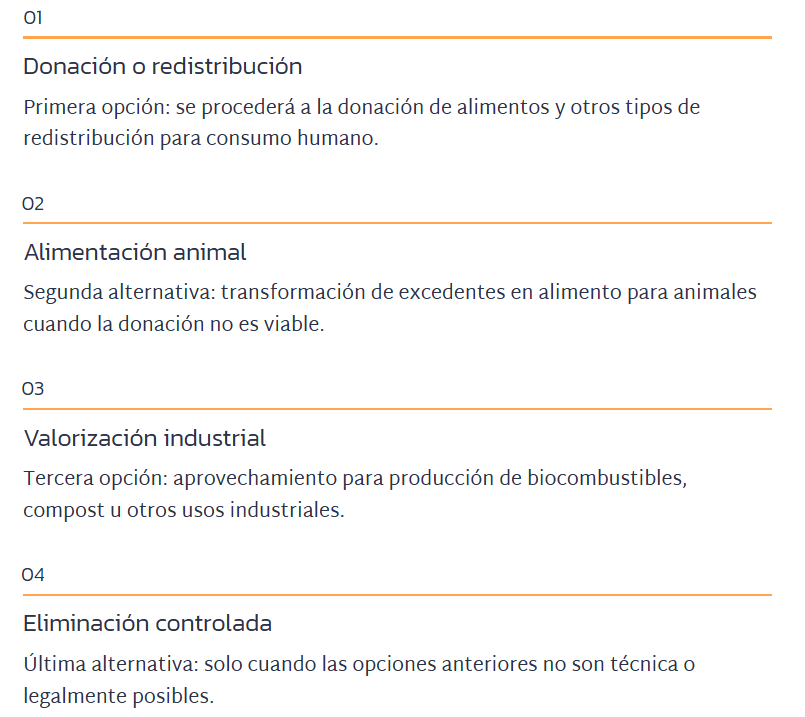 La Ley 1/2025 establece un orden de prioridad claro para la gestión de excedentes alimentarios. Cada empresa debe seguir esta jerarquía obligatoriamente, comenzando por las prioridades más sostenibles.
